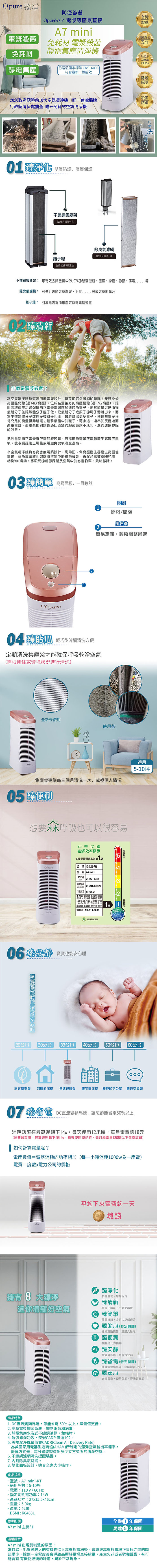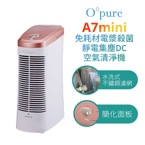 【Opure 臻淨】A7 mini 免耗材 電漿殺菌 靜電集塵 DC節能 空氣清淨機 台灣製造 一級能效 省電 小資抗敏