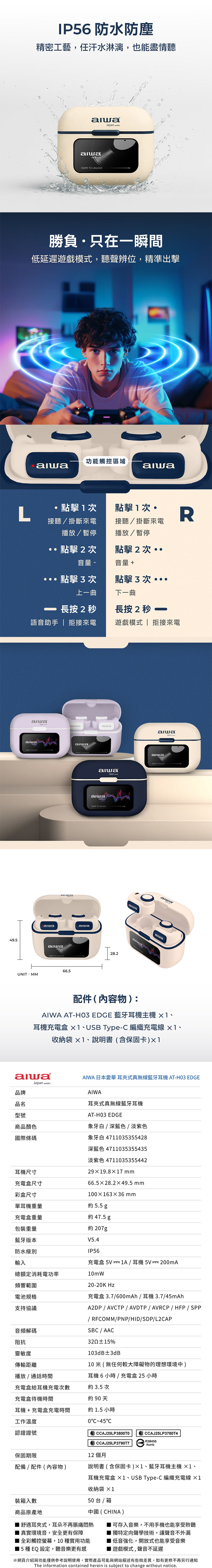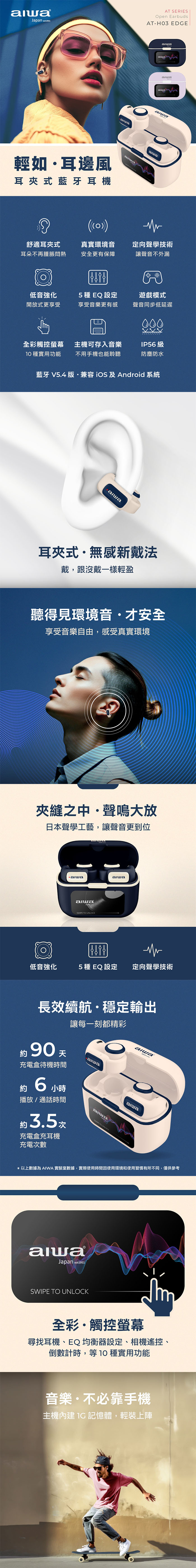 【AIWA 愛華】 耳夾式真無線藍牙耳機 AT-H03 EDGE 象牙白 / 湛藍 / 淡紫