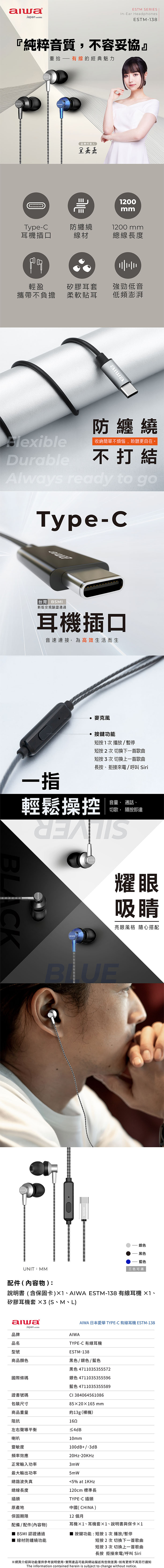 【AIWA愛華】TYPE-C有線耳機 ESTM-138 黑色/ 銀色/藍色 防纏繞 強勁低音