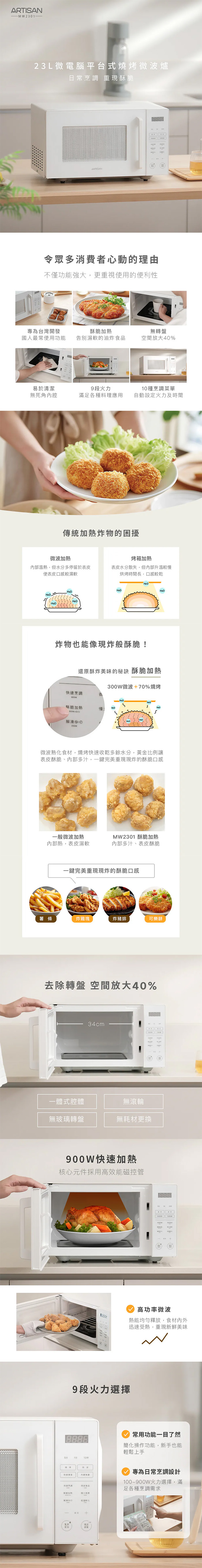 【ARTISAN 奧堤森】23L微電腦平台式燒烤微波爐 MW2301 微波爐 平台式微波爐