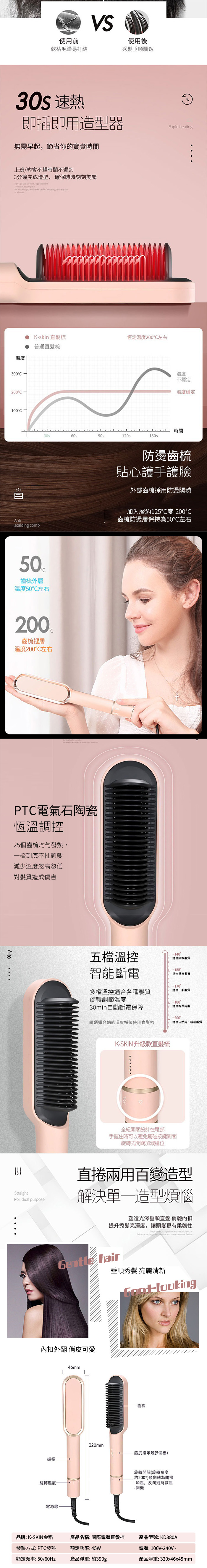 【Kskin 金稻】國際電壓溫控直髮梳 KD380A 國際電壓 溫控護髮 輕巧好攜 防燙齒梳 30秒加熱