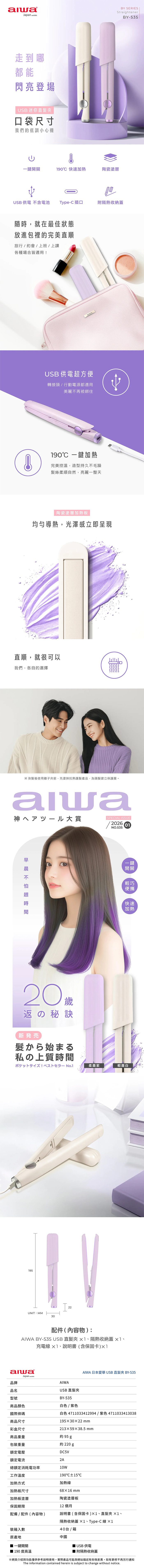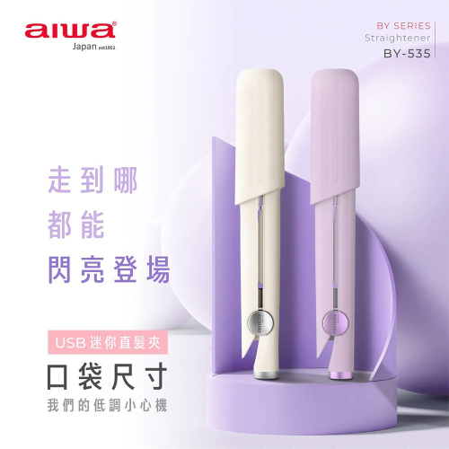 【AIWA 愛華】USB直髮夾 BY-535 白色/紫色 離子夾 夾直 夾捲 夾瀏海 迷你直髮夾 攜帶方便