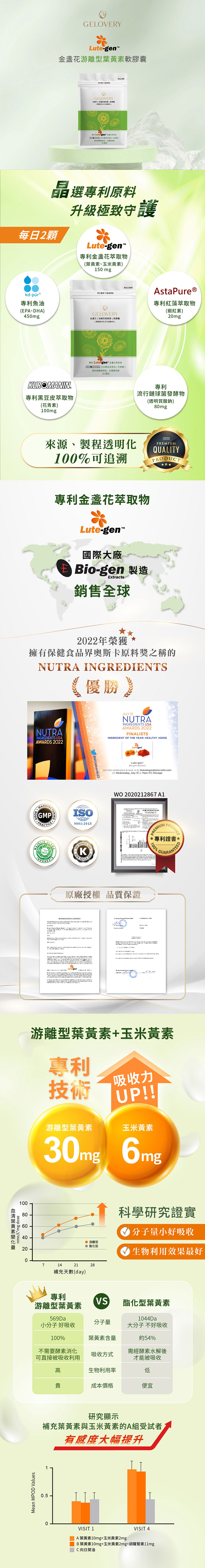 挑戰市售最高規格“頂級葉黃素”! .唯一符合歐洲藥典的瑞士山桑子萃取物 160mg,含39%花青素之王-矢車菊素C3G(飛行員必吃!) .冰島Astabead雨生紅球藻萃取物160mg,爆量添加高濃度5%蝦紅素 聚焦動靜遠近的關鍵!(蝦紅素純量8mg) .專利美國Flora GLO葉黃素 100mg .專利美國ZeaONE玉米黃素 40mg .專利日本黑豆皮添加(花青素)100mg .添加日本專利Hyabest透明質酸鈉(玻尿酸)80mg,法規最高劑量,水潤超有感~ .潤澤晶亮關鍵:德國專利MaquiBright®智利酒果萃取 40mg 一天兩顆飯後食用 膠囊殼使用素食膠囊Vcaps Plus,全素可食! 頂級金盞花葉黃素膠囊 包裝尺寸:10.5x16.5cm