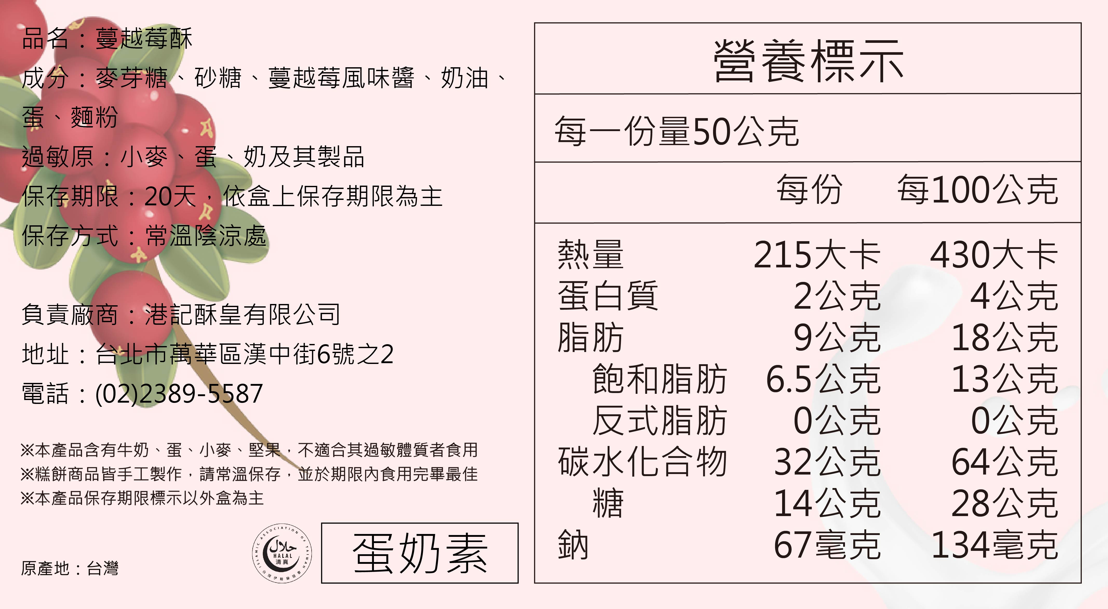 【商品主要成份】進口奶油、蔓越莓風味醬、雞蛋、糖、麵粉。