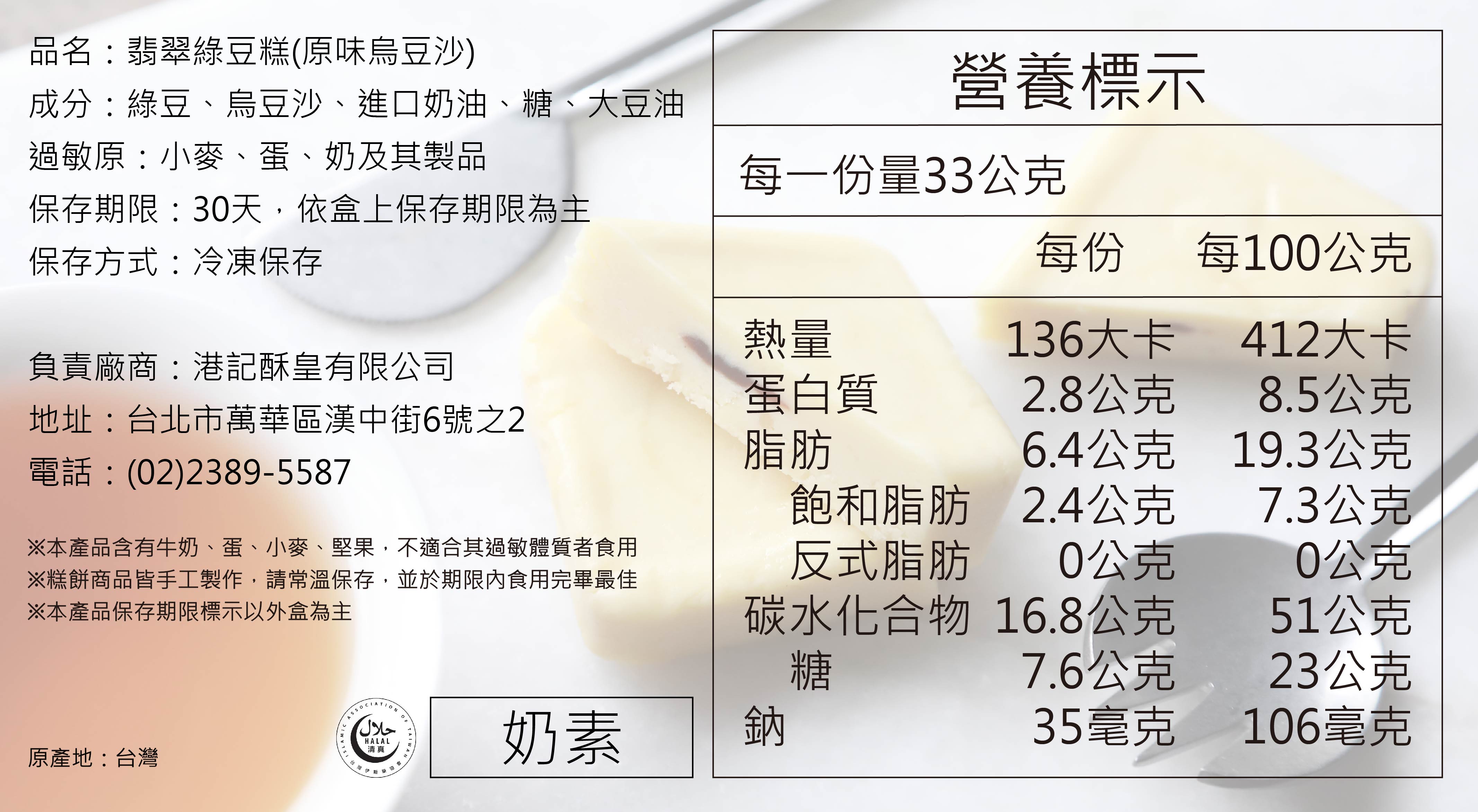 【商品主要成份】進口奶油、烏豆沙、綠豆仁、糖。