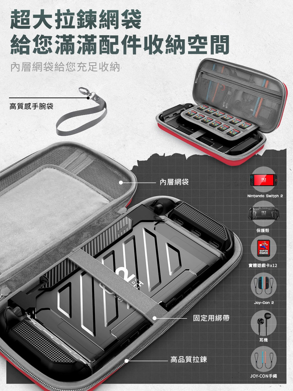●最大儲存容量:適用於 Nintendo 任天堂 Switch 2,設有一個大型儲物隔層,適用於 Joy-Cons、電纜和多達 12 個遊戲盒。 內部網眼口袋使配件整齊且易於拿取。