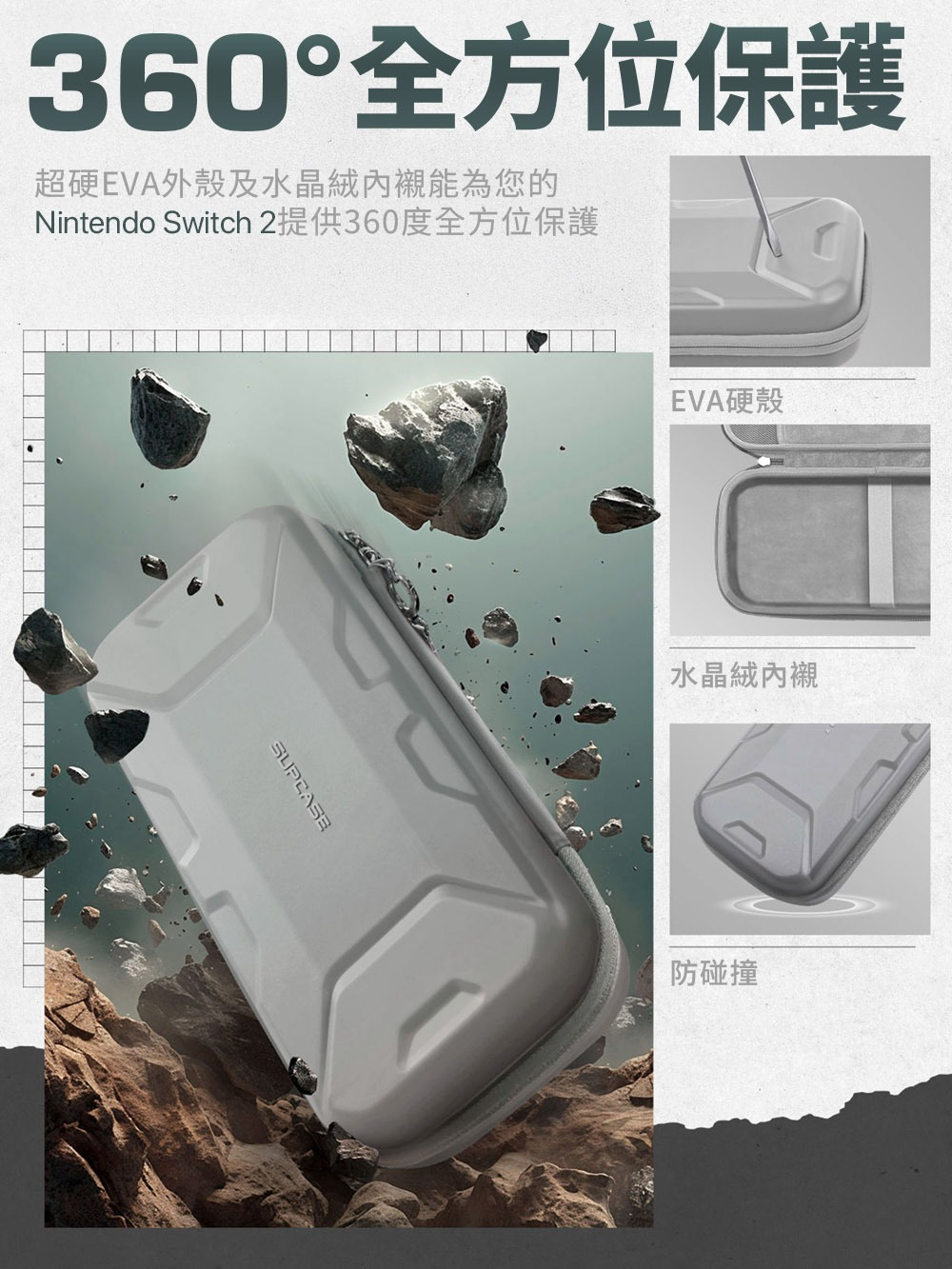 ●EVA 硬殼+毛絨水晶天鵝絨內部:外部由超硬 EVA 外殼製成,提供耐壓、防摔保護和防水表面,以防止 Switch 2 因跌落或水暴露而損壞。 內部採用超柔軟水晶天鵝絨襯裡,可防止控制台機身和屏幕上的划痕,為您的設備提供有效的 360° 保護。