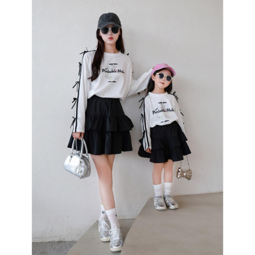 卡通印花蝴蝶結綁帶上衣 蛋糕裙 長袖 圓領 短裙 長裙