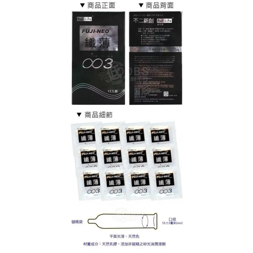 不二保險套系列  纖薄003/愛鳥/櫻花/零零/艾康頓/芙莉詩   超薄型衛生套 保險套 有效期間:5年 產品許可證字號:衛署醫器製字第001734號 製造廠名稱: 台灣不二實業股份有限公司 製造廠地址: 新北市淡水區行忠路132號 藥商名稱: 台灣不二實業股份有限公司 藥商地址: 新北市淡水區行忠路132號1樓 藥商許可執照字號:新北府淡衛藥販 字第MD6231051073號 產地:台灣 貨源:原廠公司貨 「請放置於陰涼乾燥處,使用前應詳閱產品說明書」 -此為私人消耗性衛生用品,一經”拆封”或”使用”後,即無法退換貨,不便之處敬請見諒 藥商許可執照字號:桃市藥販 字第6232106531號 藥商名稱:陽光娃娃生活館 藥商電話:0989-600039(am10:00-pm5:00)                                             退換貨須知: ●此款盒裝裁切線偶有裂開,因內裝為單片包裝,所以不構成退貨標準,介意的買家請考慮後再下單。 ●因衛生考量而密封之個人衛生用品,如拆封檢查試穿(用)後再次出售,有影響衛生之虞。故除商品本身有瑕疵外, 縱使拆封後可恢復原狀,均不提供退換貨服務,請務必確認有購買商品需求再行拆封,以免影響權益。 ●個人衛生用品,物品寄出,不接受任何,色差不符合期待、衛生套尺寸不符、一切因個人主觀之問題,皆無鑑賞期, 不接受退換貨。 #柴語錄 #衛生套 #保險套 #CONDOM #台灣不二實業有限公司 #FUJICONDOM #MIT #台灣製 #GAMEBOY #勁小子