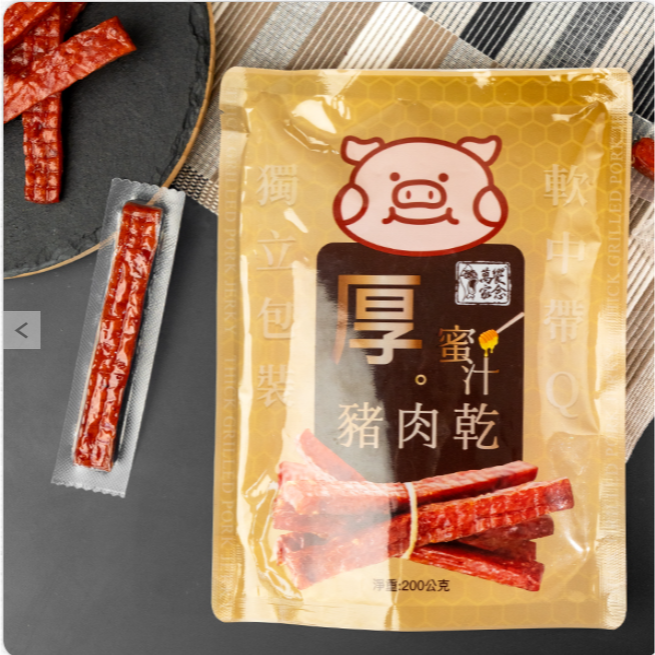 每一條都有獨立真空包裝! 加上獨門秘方和香甜蜜之使豬肉的肉香濃郁、色澤誘人。 選用台灣豬後腿肉,製成厚達1cm的肉條,Q彈蘊含肉汁。