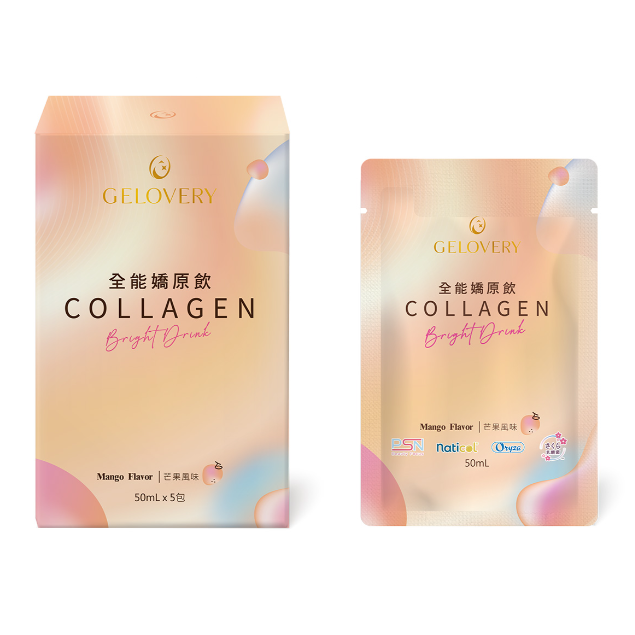 💛 Gelovery 全能膠原飲(芒果風味)|由內而外,增加風采! 嚴選法國、日本多國專利成分,結合深海魚膠原蛋白與維他命C、專利益生菌與植物萃取 每日一包,啟動青春能量,再現風華。 🌟 四大特色亮點 ✨ 專利膠原蛋白 10000 mg — 小分子好吸收,維持肌膚彈性 🥭 芒果果汁基底 — 清爽果香,酸甜順口,好喝又有感 🍊 富含維生素C、櫻花萃取物、— 輕鬆補給美顏營養 🦠 添加獨家櫻花益生菌 — 調整體質、幫助維持消化道機能,打造由內而外的亮麗 💡 每天 1 包,輕鬆補充膠原蛋白與美麗能量! 【產品規格】 每包 50 ml,共 5 包 【關鍵成份(每份)】 專利魚膠原蛋白 10000 mg 專利櫻花萃取物 50 mg 獨家櫻花乳酸菌 50 mg 專利鮭魚鼻軟骨萃取物 50 mg