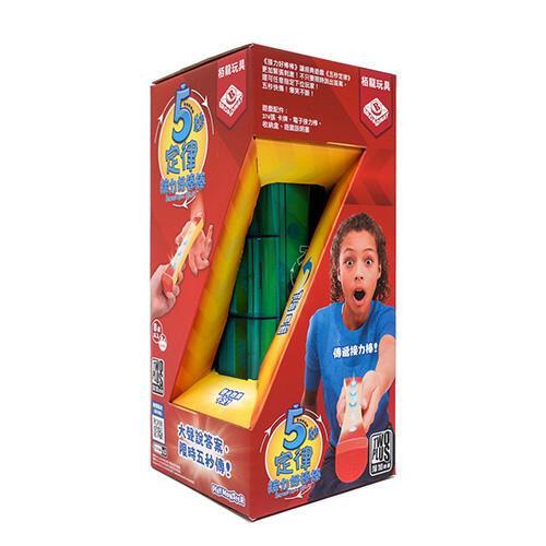 遊戲資訊 遊戲人數:2+ 遊戲時間:5-15分鐘 適合年齡:8+ 五秒定律科技大升級!這次推出了聲光特效絕佳的接力棒,玩家只要喊出答案,然後將棒子交給下一位玩家,棒子就會自動感應開始5秒倒數,說出答案交棒或者使用功能卡躲避,誰會是腦力枯竭的最後一棒呢? 配件內容 題目牌 x 350張 生命牌 x 12張 跳過牌 x 12張 接力好棒棒 x 1 支 遊戲目標 成為最後被淘汰的玩家! 規則簡介 5秒定律:接力好棒棒 1、將生命牌和跳過牌平均發給每位玩家,多餘的不使用。 2、隨意一位玩家拿取接力棒,另一位玩家抽取題目牌並唸出題目,持有接力棒的玩家立即按壓接力棒的按鈕,開啟五秒倒數! 3、持棒玩家必須在五秒內說除一個符合題目的答案,並將接力棒任意傳給另一位玩家,傳棒後時間會自動重新開啟倒數,接棒的玩家必須在五秒內說出一個不重複的答案,並再次傳棒。 4、過程中,玩家可打出跳過牌直接略過此局。傳棒不需依照座位順序,也不必平均傳給每位玩家,全看玩家心情決定。遊戲持續進行到有玩家說不出答案為止,該玩家就丟棄一張生命牌。 5、丟棄所有生命牌的玩家出局,最後一位沒被淘汰的玩家獲勝!