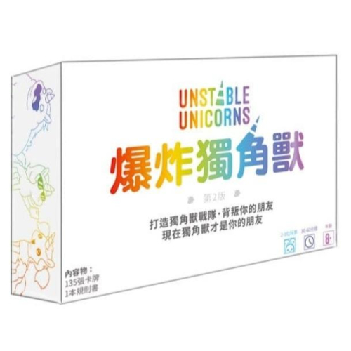 ★遊戲適合8+歲以上,2-8名玩家一同遊玩,遊戲時間30分鐘 ★打造獨角獸戰隊.背叛你的朋友.現在獨角獸才是你的朋友 ★這款策略卡牌遊戲有著你最愛的兩個事物:獨角獸和破壞! 【產品說明】 《 爆炸獨角獸 》是一款可愛又輕鬆有趣的派對遊戲,遊戲玩法很簡單!輪到你先抽一張牌,再來打出一張卡牌並發動效果或者再抽一張牌! 在你的面前是你的柵,你的柵欄中會放置你所打出的卡牌,玩家要在自己的柵欄中收集足夠數量的獨角獸來獲勝,出牌來破壞對手的獨角獸,或是偷走他們! 有時候也不得已要做出一些犧牲,或是使出休想來讓對手卡牌失效!