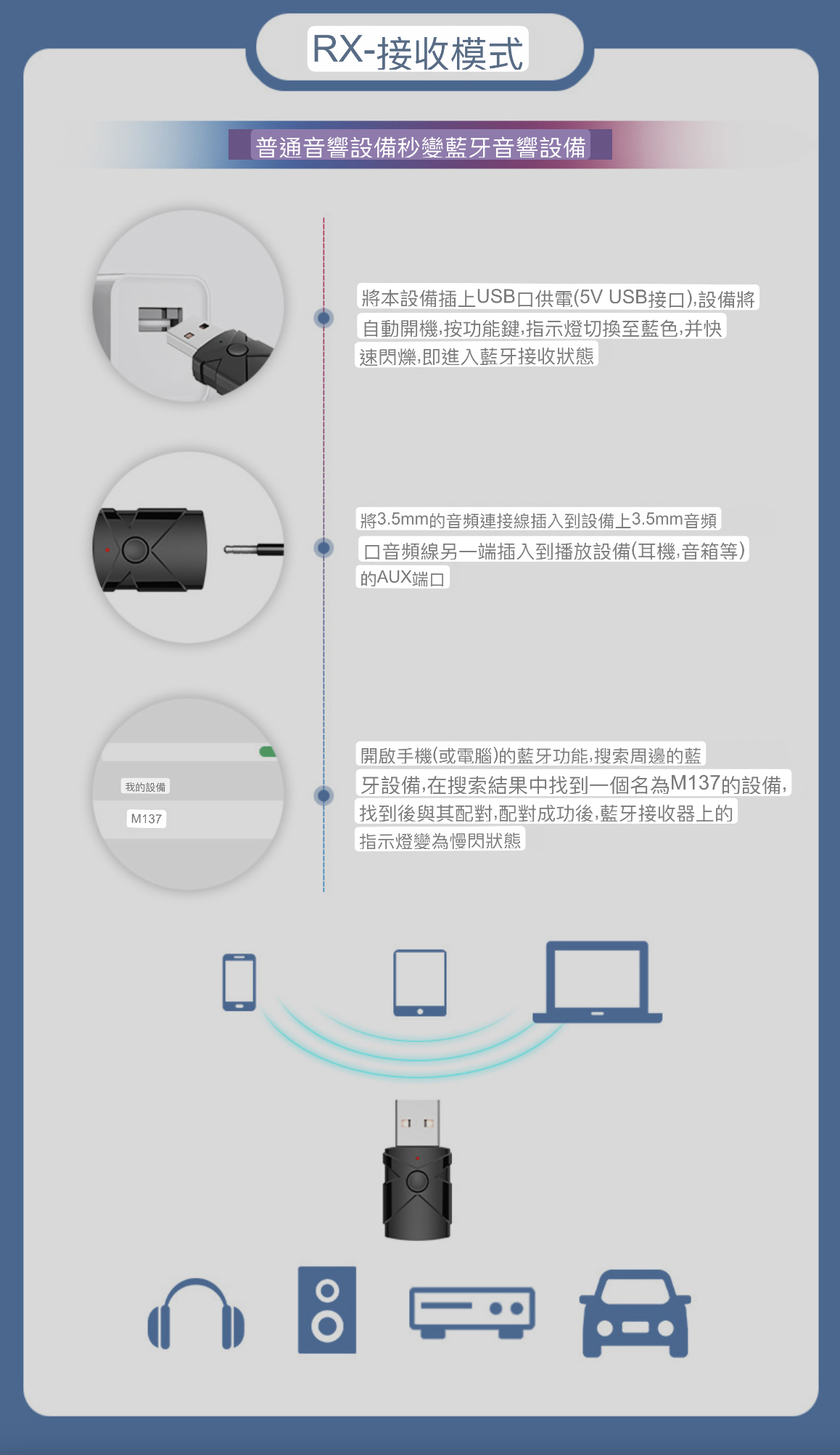 接收模式:可使用多種方式,USB訊號孔/3.5mm音頻線/ RCA音源線(紅白線),將產品連接到音頻設備,然後在要配對的手機的藍牙設置中找到藍芽名稱。配對過程中藍燈閃爍,配對成功後藍燈停止閃爍。
