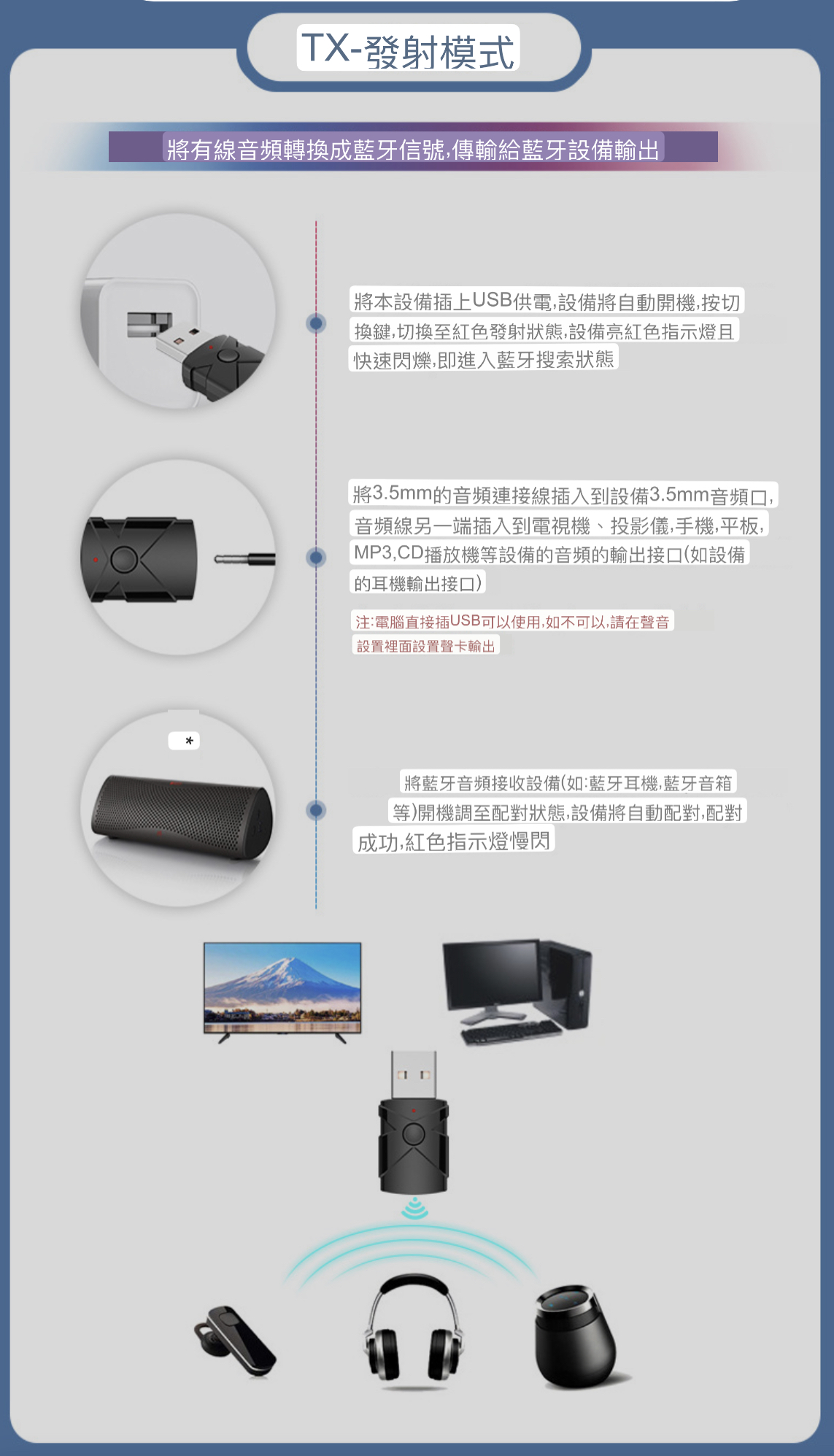 TX模式:可使用多種方式,USB訊號孔/3.5mm音頻線/ RCA音源線(紅白線),將產品連接到電視等設備,TX模式將自動搜索其他藍牙接收設備(例如藍牙耳機,藍牙揚聲器,藍牙接收器等)。 配對期間紅燈閃爍,配對成功後紅燈停止閃爍。