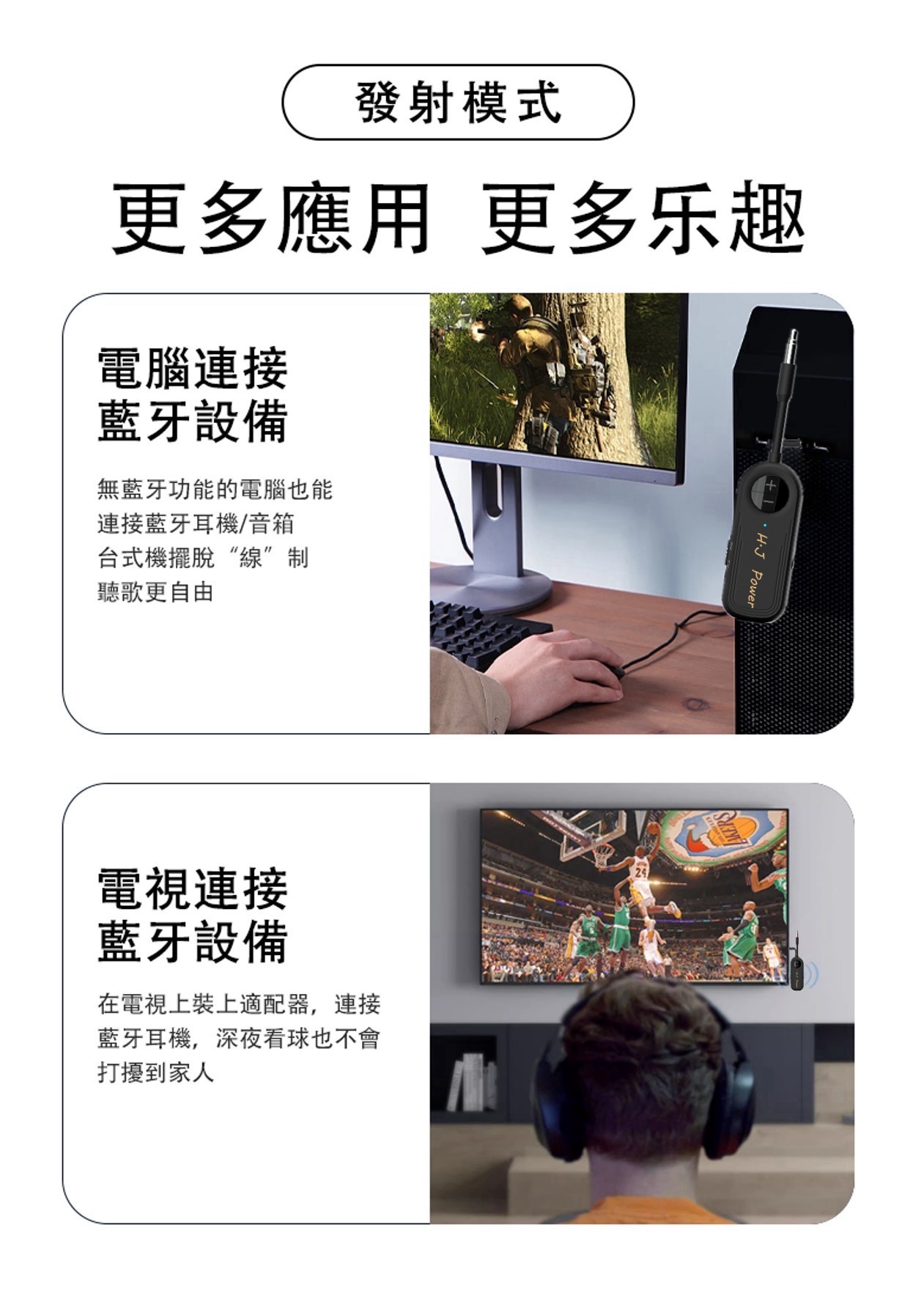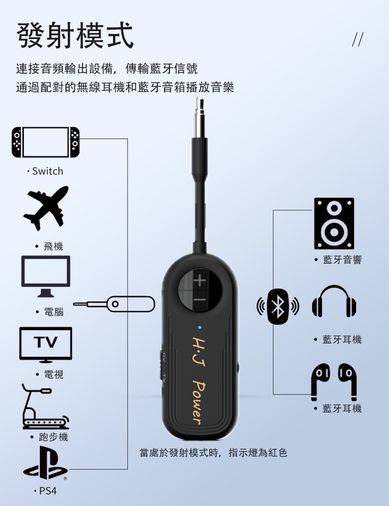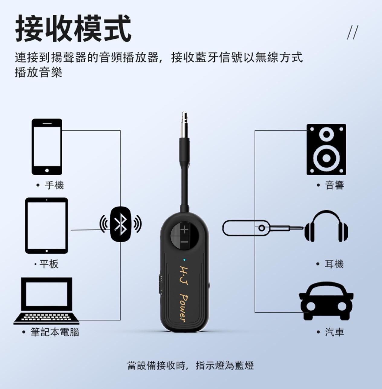 一個設備可以在接收模式下接收手機的音樂並播放到音響上,也可以在發射模式下將電視的音頻信號發送到藍牙耳機。
