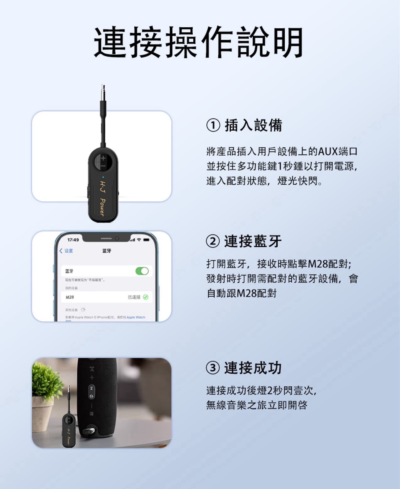 🏆如果沒有藍牙可用,請使用 M28,允許有線喇叭 / 條形音箱、租車和船用音響系統等項目無線接收來自遊戲設備、手機或平板電腦的音頻。