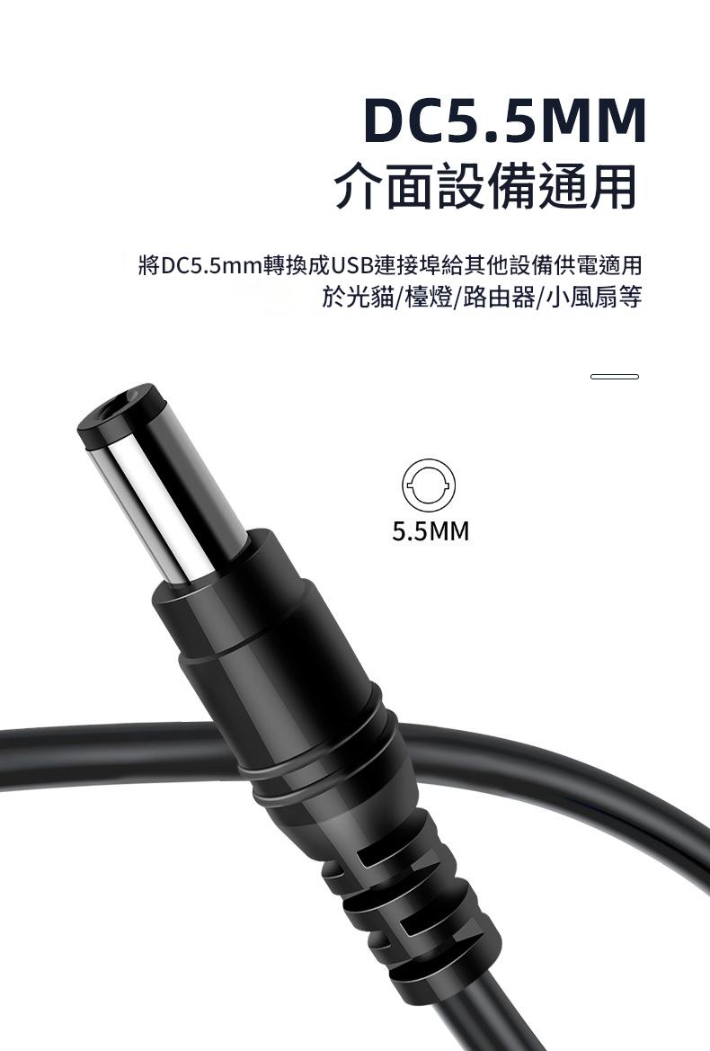 常見小型電子用品多採用此規格,本商品直接附 DC5.5×2.1mm 公頭,插上即可供電。