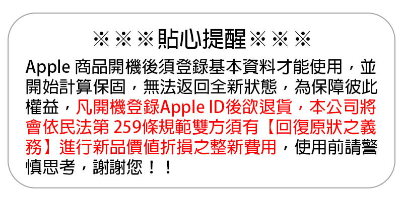 ※為維護您的退貨權益,退回的商品須為全新狀態且完整包裝,連同配件贈品勿缺件,如因拆封或使用導致無法回復原狀,本公司將會依民法第259條規範雙方須有【回復原狀之義務】進行新品價值折損之整新費用。