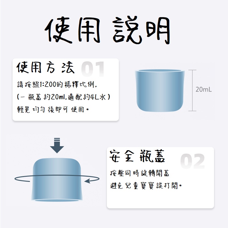 使用方法:在清潔基地台的清水箱裝滿水的情況下,添加入1瓶蓋的清潔液(約20ml),建議依照1: 200左右的比例進行稀釋,輕輕搖晃均勻後即可使用。