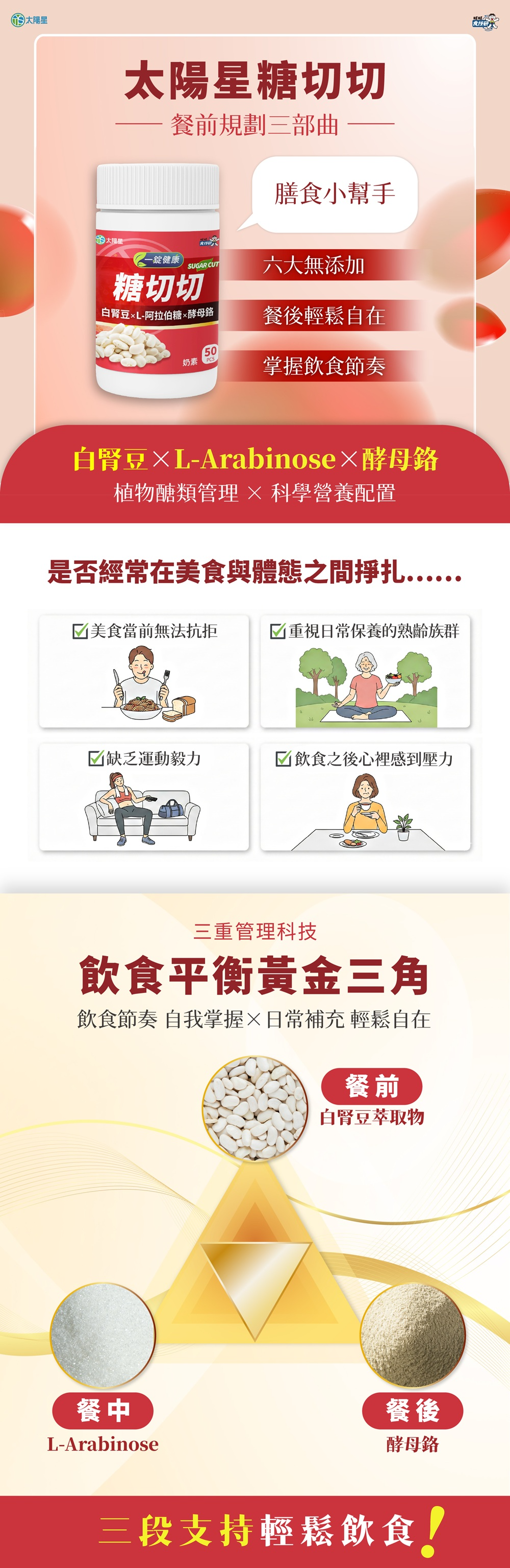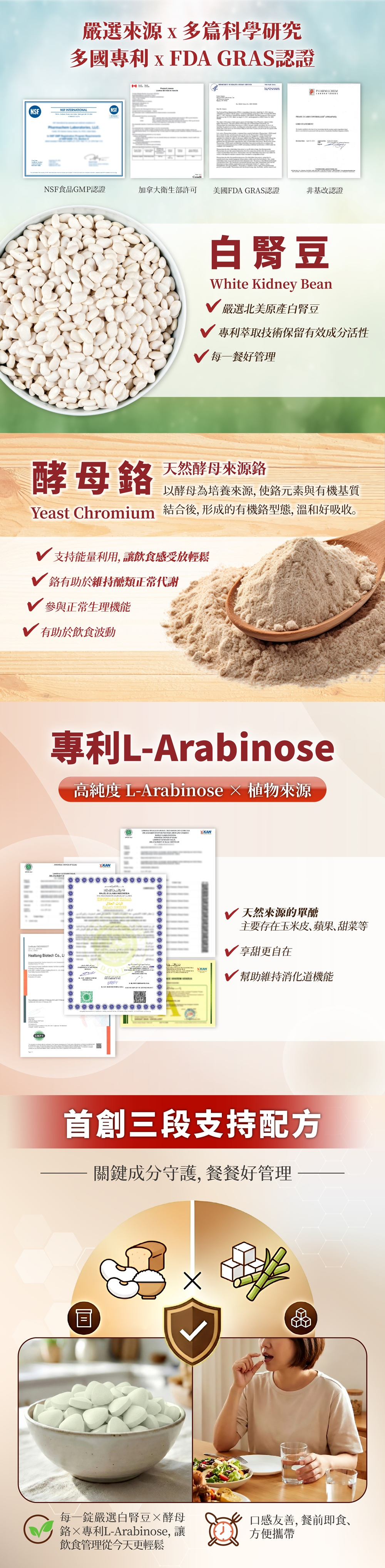 ☆輕盈生活黃金三角:餐前白腎豆萃取物、餐中L-Arabinose、餐後酵母鉻