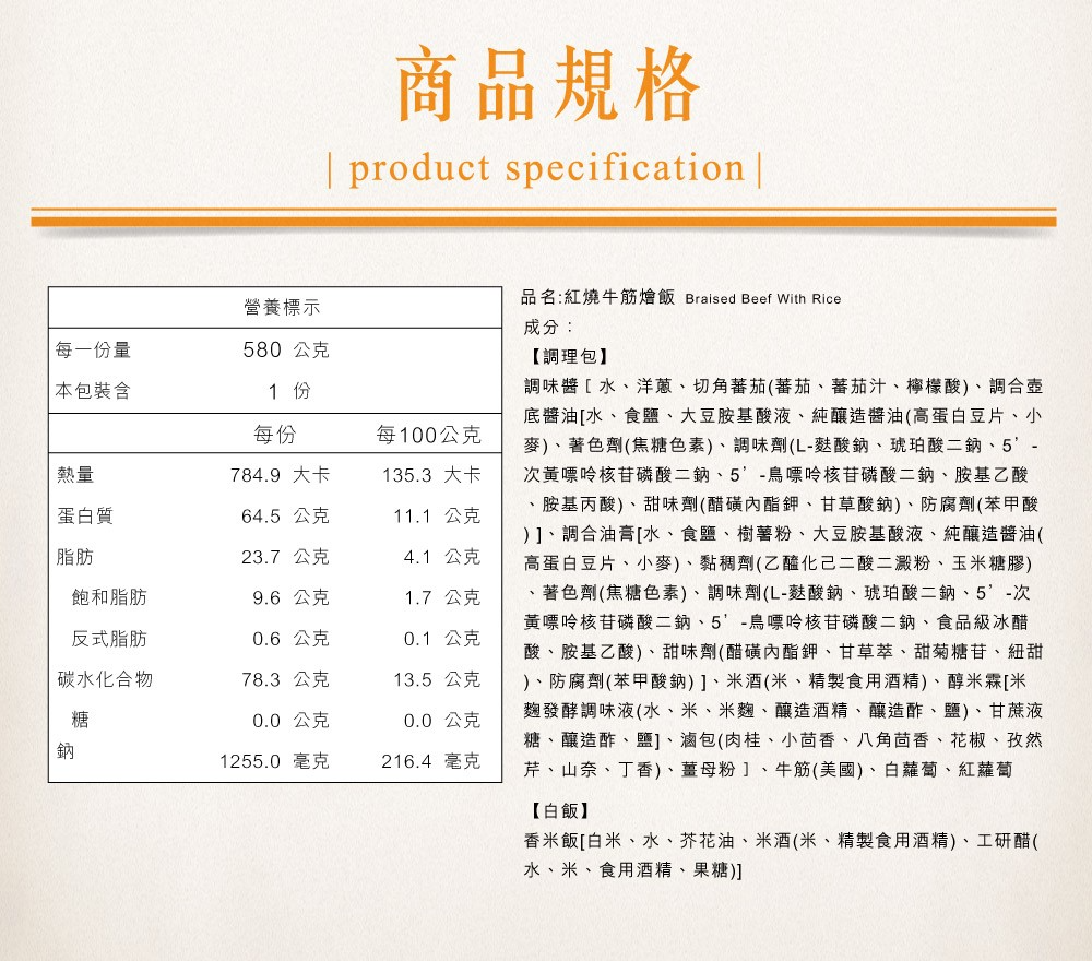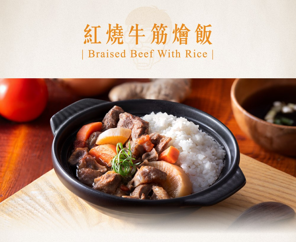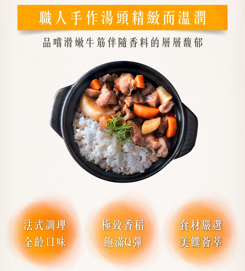 由星級主廚監製,以私藏配方熬製大師級的獨特湯頭。使用特選美國Choice牛肉,鬼斧神工的手工精切,黃金比例半筋半肉打造出完美口感。慢火燉煮,將牛肉膠質細膩地釋放在濃郁醬汁中,再搭配精選長米,Q彈飽滿且粒粒分明。白飯以最新日本新科技包裝,自動洩氣模擬蒸飯過程,讓微波加熱也有能吃到現煮白飯的滿滿感動。