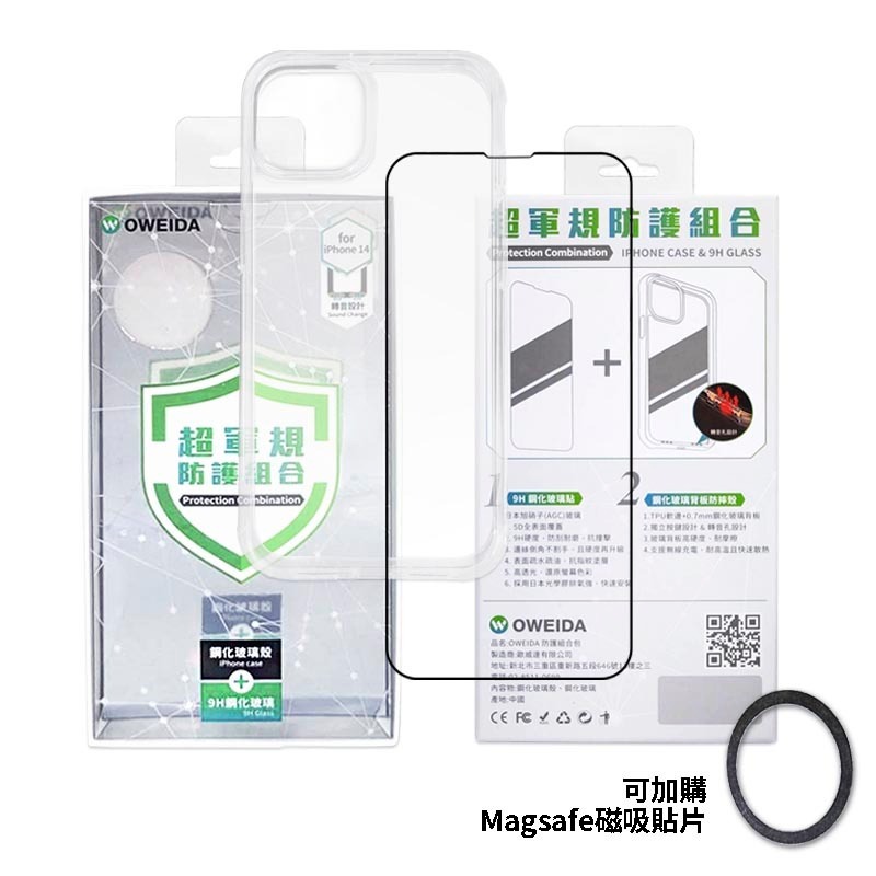 玻璃氣墊防摔殼x1、滿版鋼化玻璃貼x1、貼膜工具包x1、(可加購MagSafe磁吸扣環)