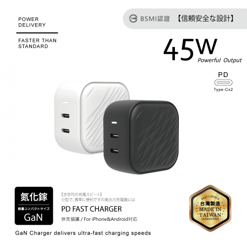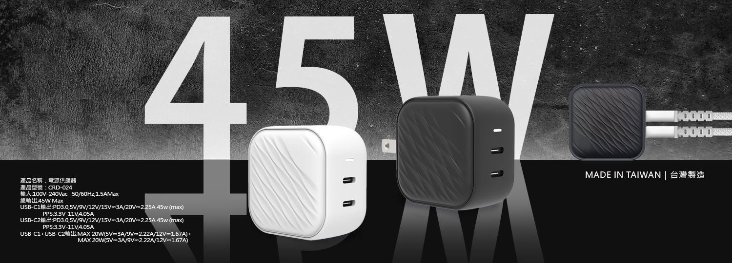 USB-C2輸出:PD3.0,5V/9V/12V/15Vm3A/20Vm2.25A 45w (max)