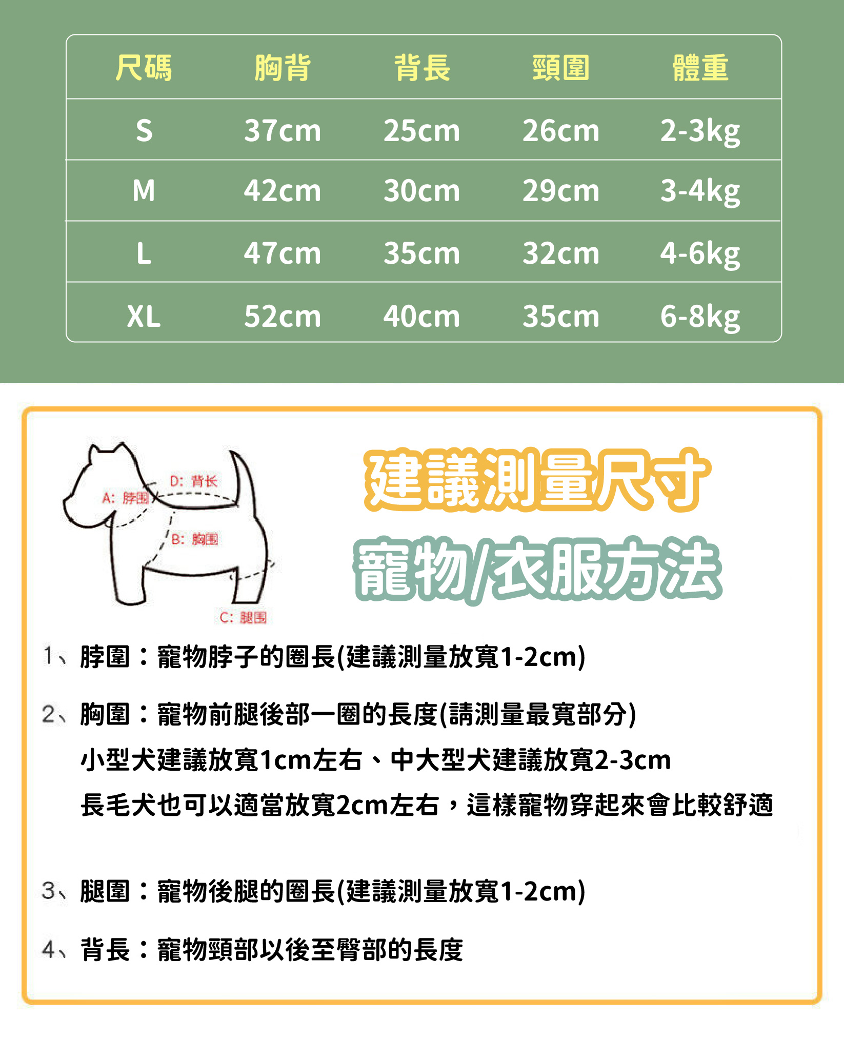 L 胸背 47cm 背長 35cm 頸圍 32cm 毛小孩/愛喵適合體重範圍 4-6kg