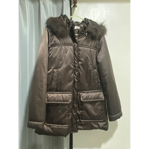 亮深咖啡色,長版帶帽(可拆),肩寬40cm,衣長68cm。