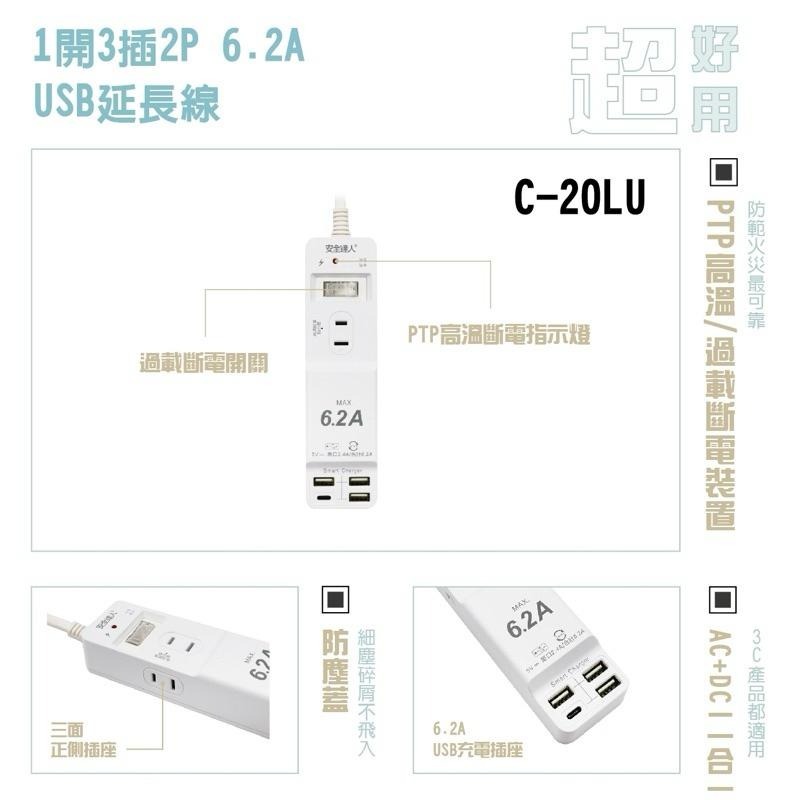 🚚原廠授權經銷商,現貨附發票🏪 C20LU快充版 2P USB延長線 插座 延長線 安全裝置 安全開關 自動斷電 快充