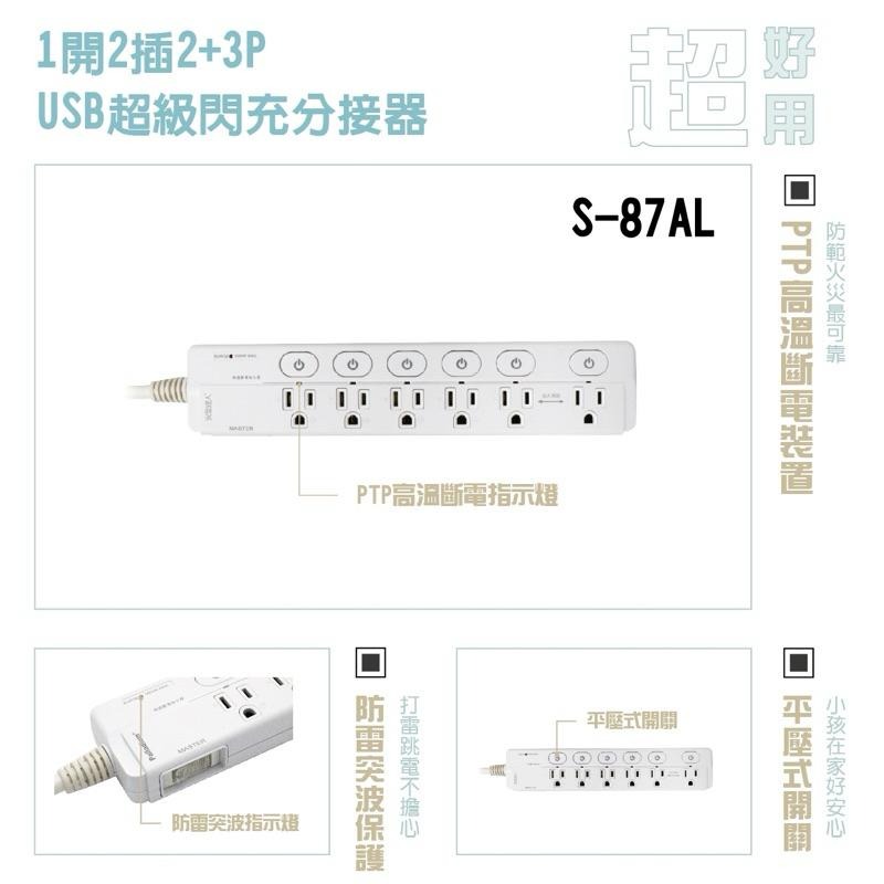 https://s-cf-tw.shopeesz.com/file/tw-11134208-7r98y-lruwswr27niqe8 https://s-cf-tw.shopeesz.com/file/tw-11134208-7r991-luocyk81sstyf1 💥Palladium 居家守護神,通過國家檢驗局BSMI認證 💥『高溫斷電防火專利』與『過載斷電保護』,雙重防護措施,保障我們一輩子的幸福。 🔸台南現貨,工作日出貨 【商品說明】 🔸品名:安全達人S-87AL 🔸產品尺寸:約26.2x5.3x2.5cm(手工測量如有誤差請以實品為主) 🔸產品線長:1.8m 🔸產品重量:328g 🔸產品規格:6口,3孔插座 🔸使用電壓:AC 110V 🔸額定電壓:AC 125V 🔸額定電流:15A 🔸額定容量:1650W Max. 🔸主要成份:銅、PC塑膠 🔸保存期限:常溫保存10年 🔸保固期限:1年 🔸BSMI號碼:R64847 【商品特色】 👍擁有PTP高溫斷電裝置和指示燈 👍防雷突波指示燈,保護電器安全 👍雙阻燃絕緣線,內部銅線2.0m㎡ 👍電源總開關,過載自動斷電開關,合計容量超載時會自動斷電 👍本體和插座採用PC耐熱塑料,不易燃燒 👍按鍵按壓式獨立開關,不占空間 【注意事項】 ⚠️使用前請先詳見商品外包裝
