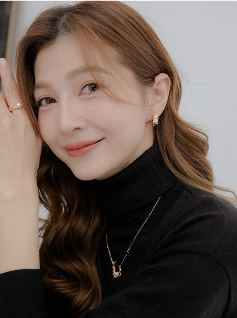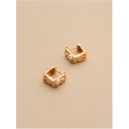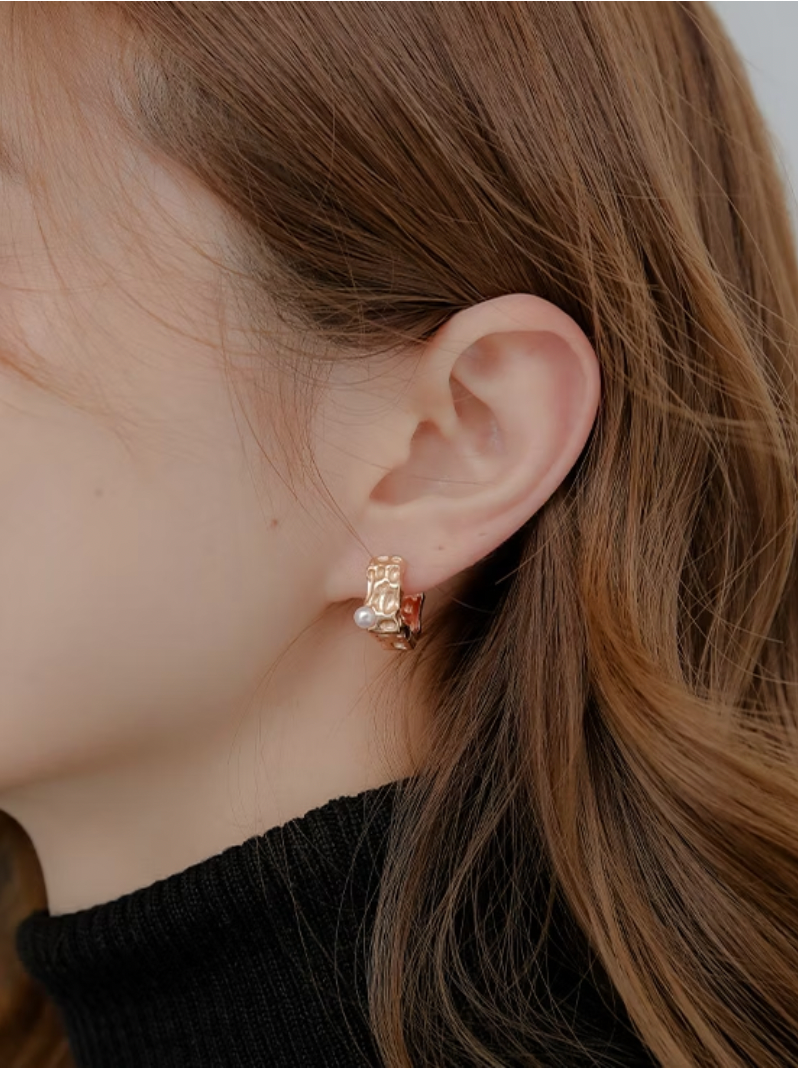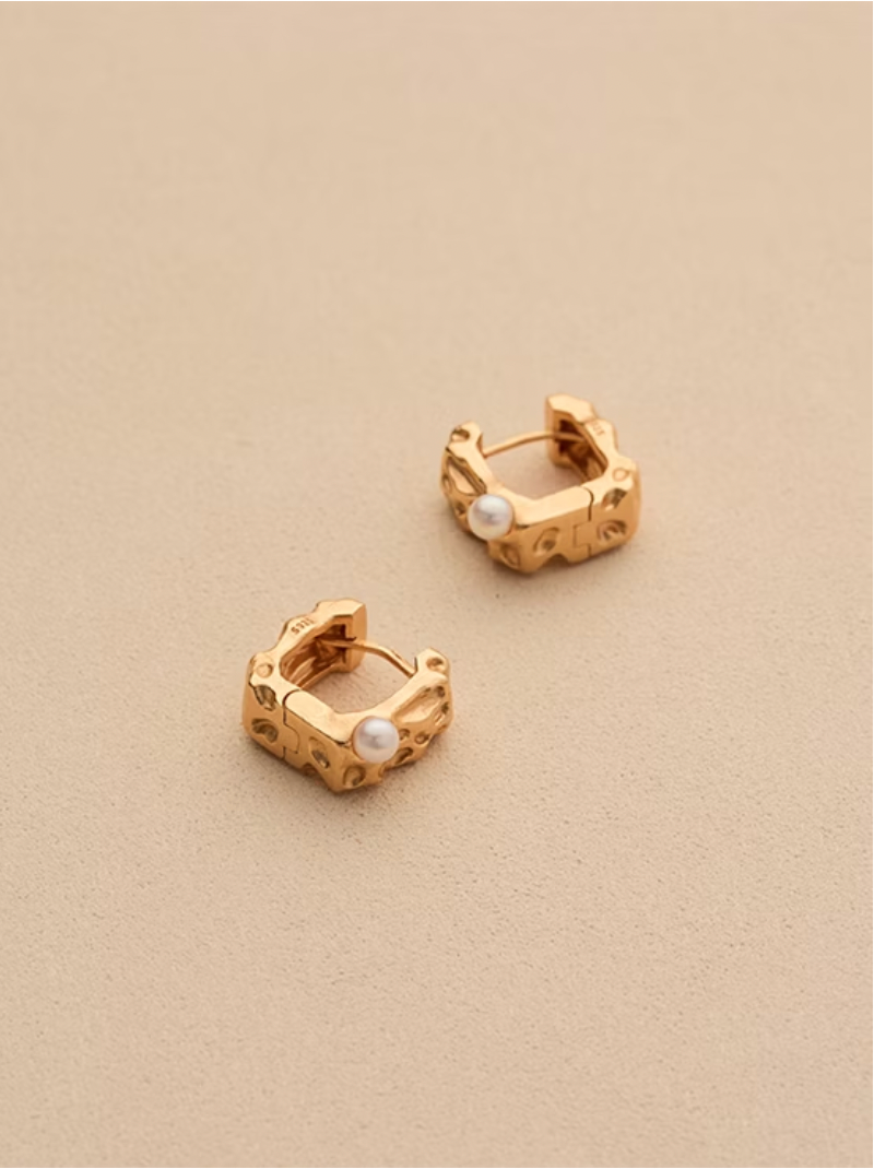 不規則的隕石坑肌理搭配極簡的方形耳釦,鑲嵌天然淡水珍珠,做霧面處理的玫瑰金色,在簡約的設計上更添手工精緻的質感~