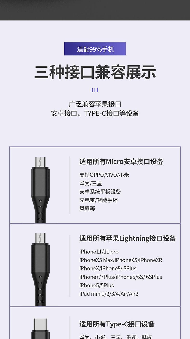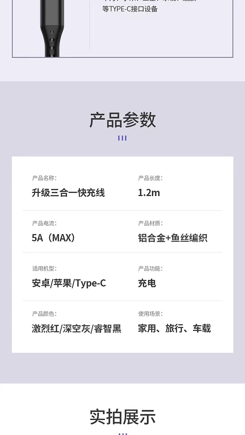 USB一拖三 5A超級快充數據線手機三合一充電線適用蘋果安卓Type-c (1.2M)