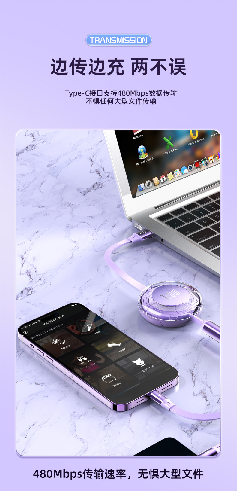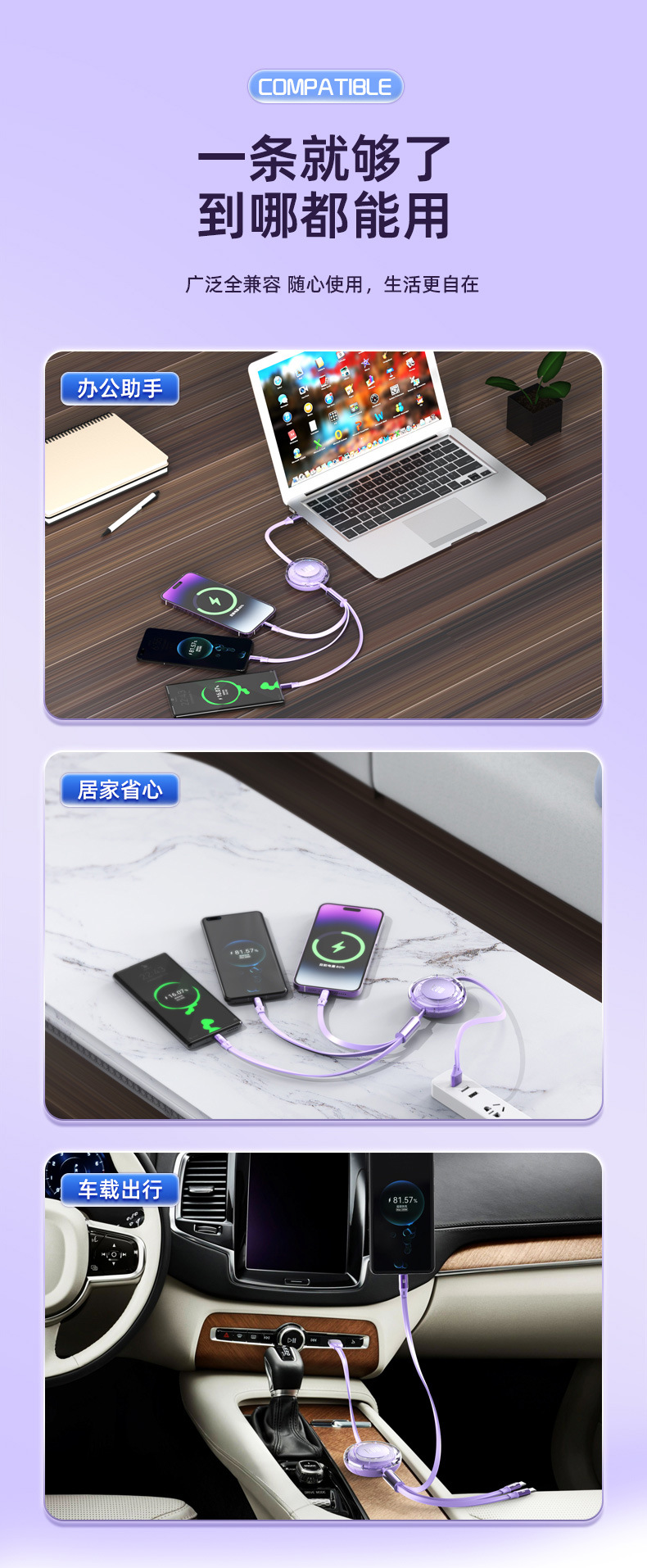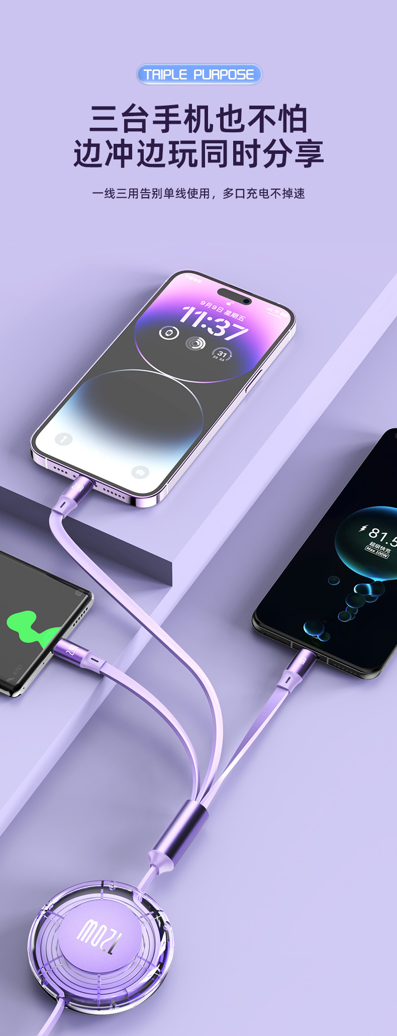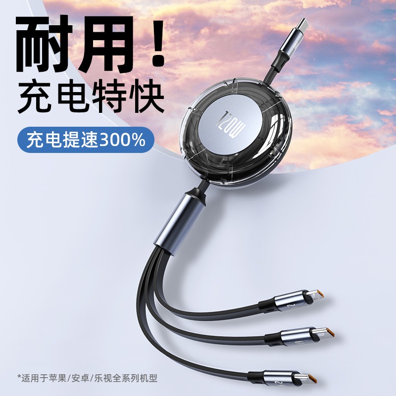 TypeC一拖三 卡斐樂伸縮數據線超級快充6A適用於華為蘋果充電線雙拉 (1.2M)