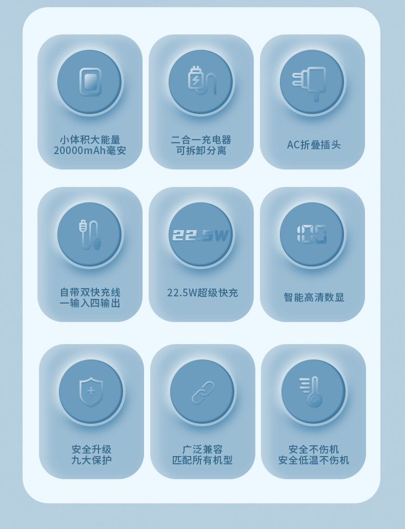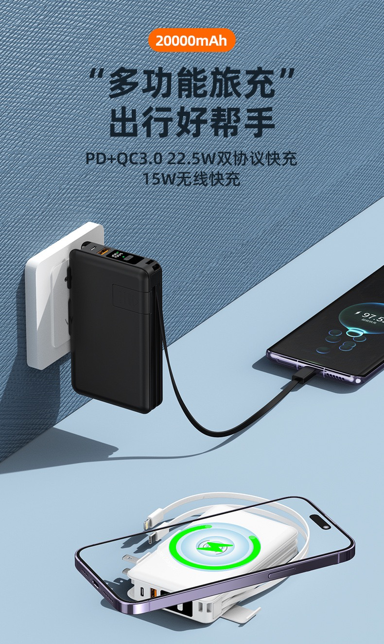 磁吸無線充電寶大容量20000毫安自帶線插頭移動電源支持快充