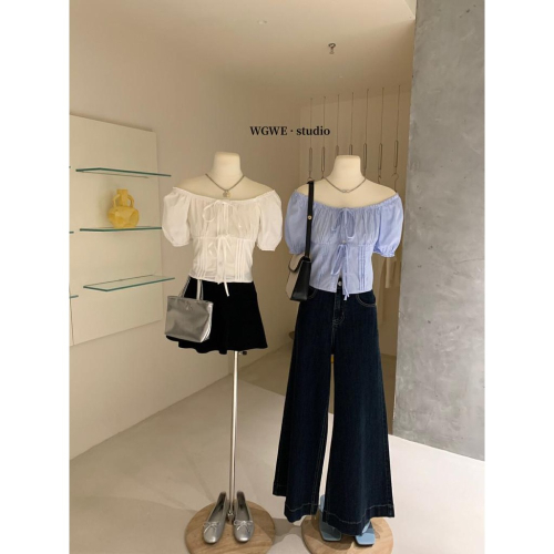 【WGWE】法式純欲性感蝴蝶結短袖襯衫一字領設計感寬松系帶上衣小衫 W3202# LKZ