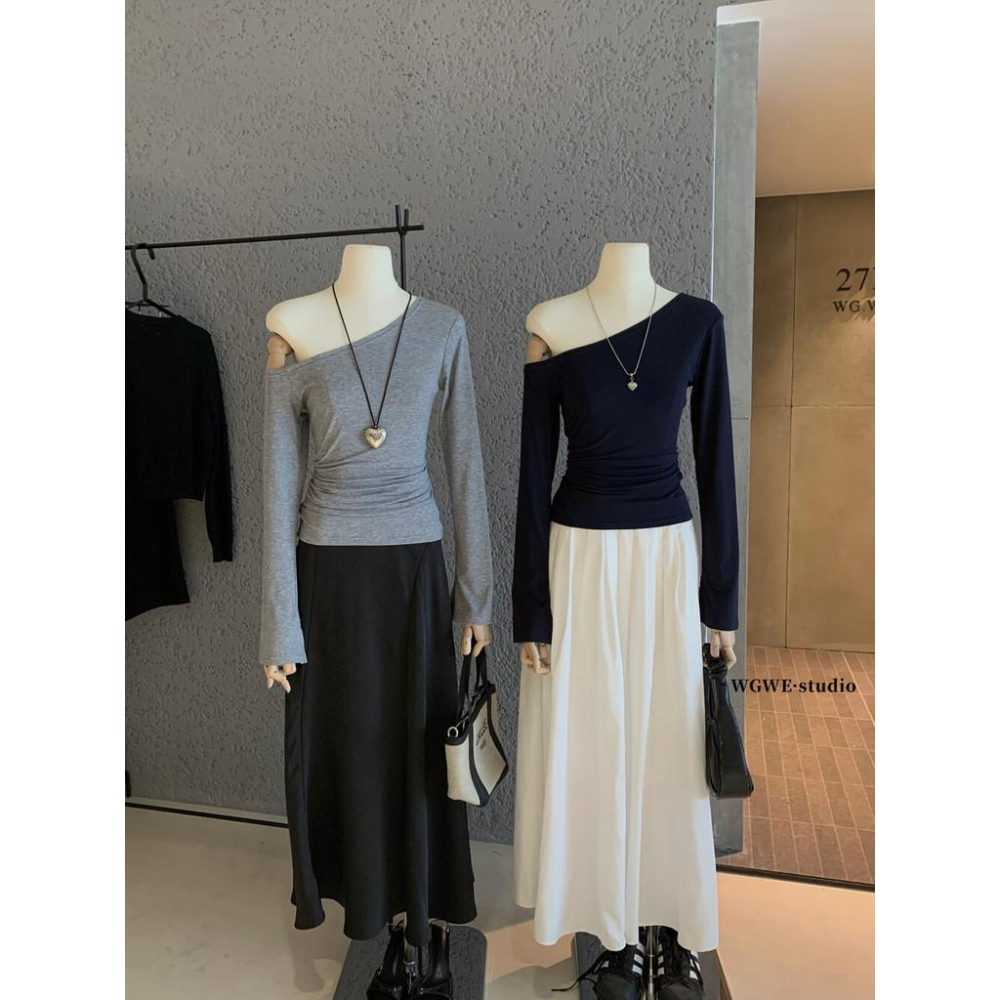 819 WGWE韓係純慾風辣妹露肩斜肩針織衫百搭減齡修身顯瘦長袖T恤W6947