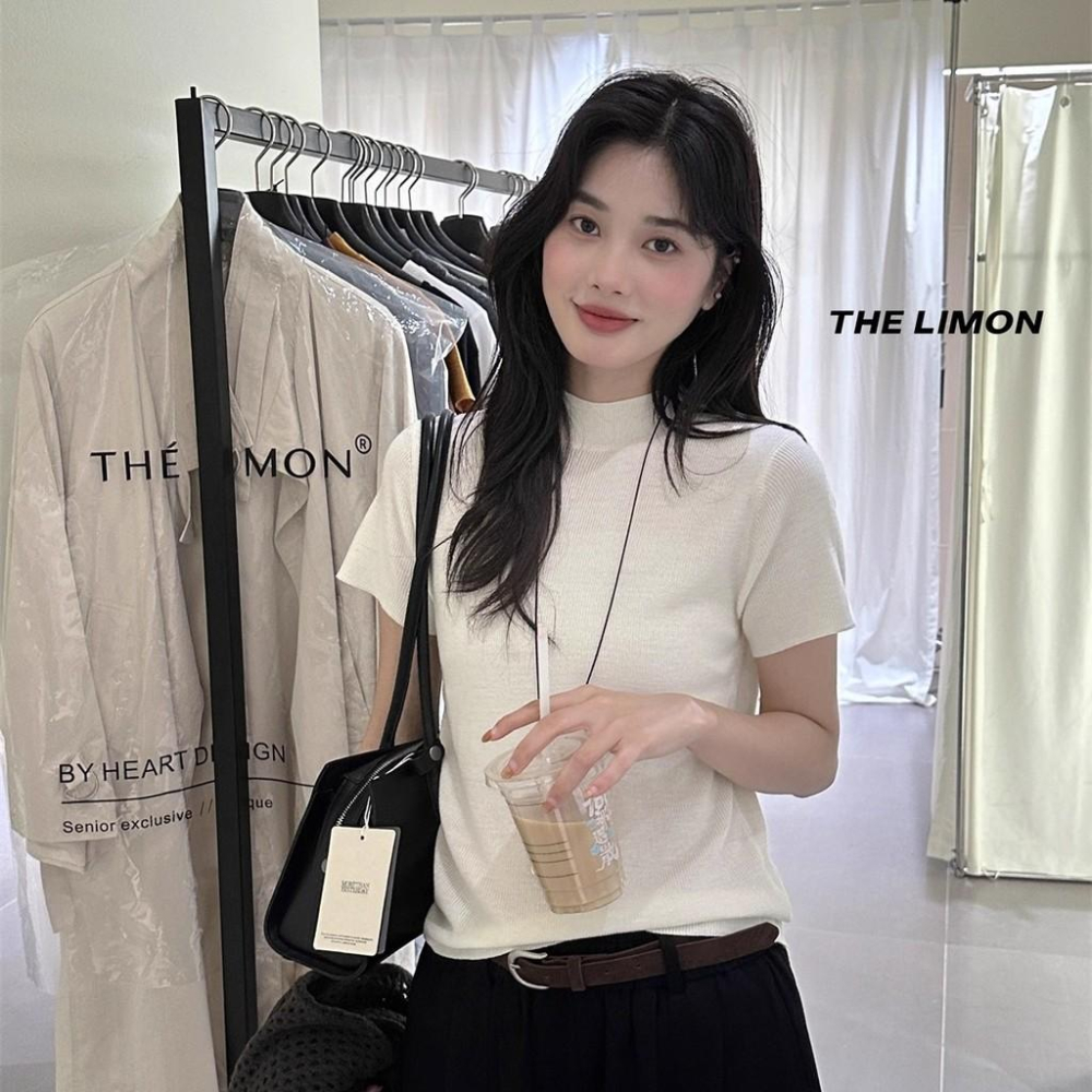 819 THE LIMON檸檬綠茶2025鞦季韓版簡約半高領短袖針織衫百搭打底衫
