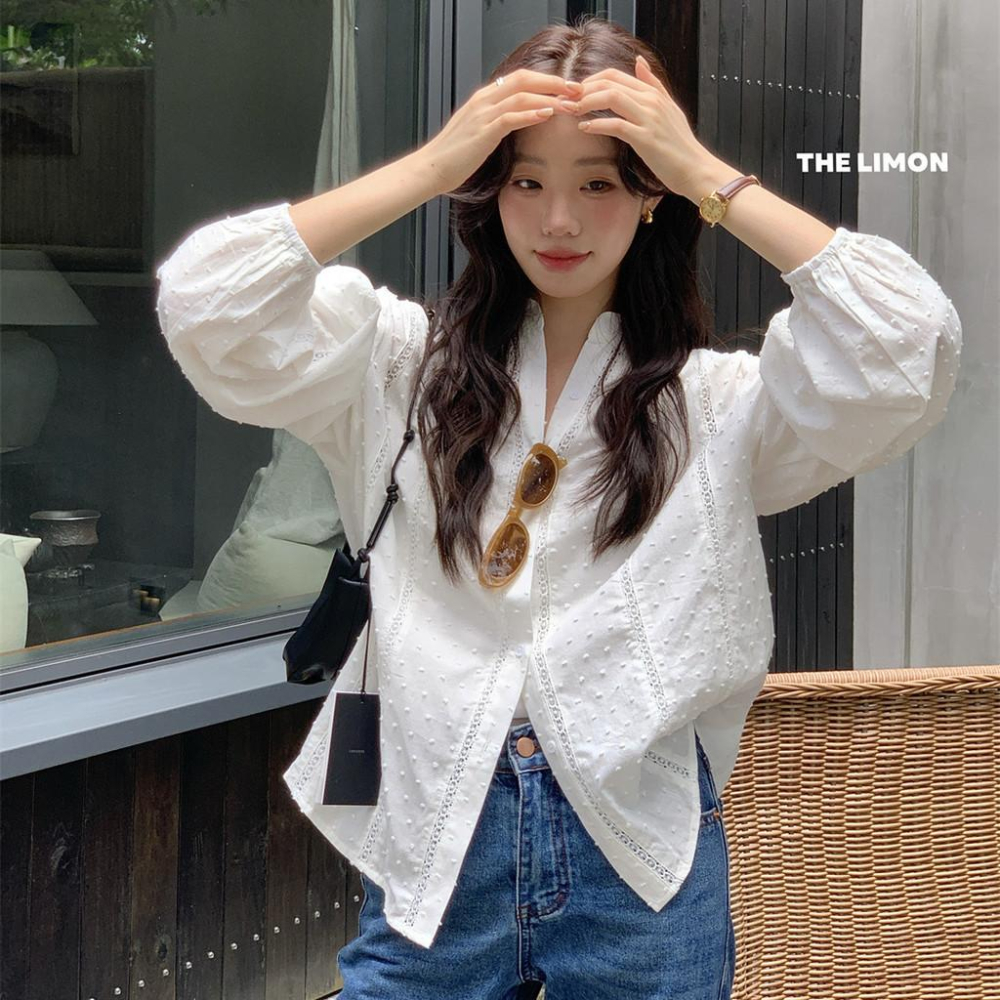 819 THE LIMON檸檬綠茶2025鞦季設計感小衆高級溫柔係法式泡泡袖上衣