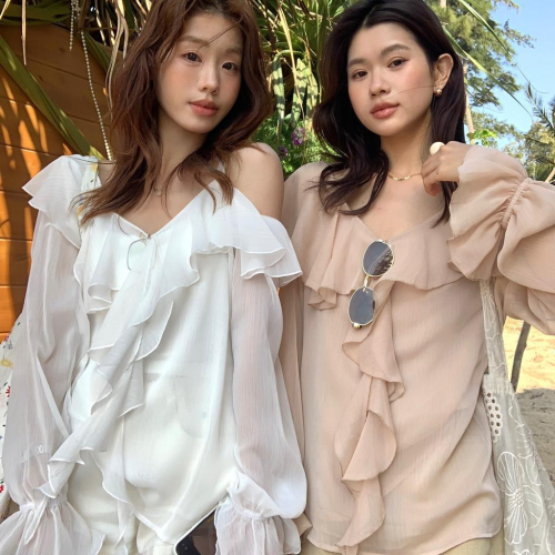 檸檬家 有點小特別~氣質溫柔荷葉邊露肩雪紡上衣小衫10172