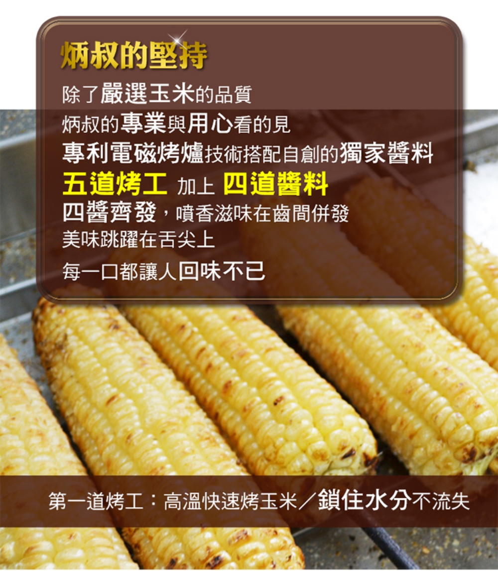夜市傳統美食的代表之一 !! 嚴選最好品質的彩虹雙色玉米,五道烤工刷上炳叔獨門四道醬料,最後搭配獨家創新的口味,成就炳叔烤玉米的經典味道