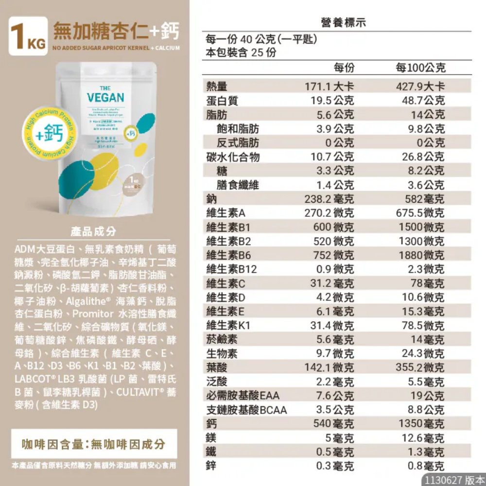 【萊素客棧】樂維根-THE VEGAN 骨力植物高鈣優蛋白 無加糖杏仁 1kg 世界級規格 常溫 全素 素食