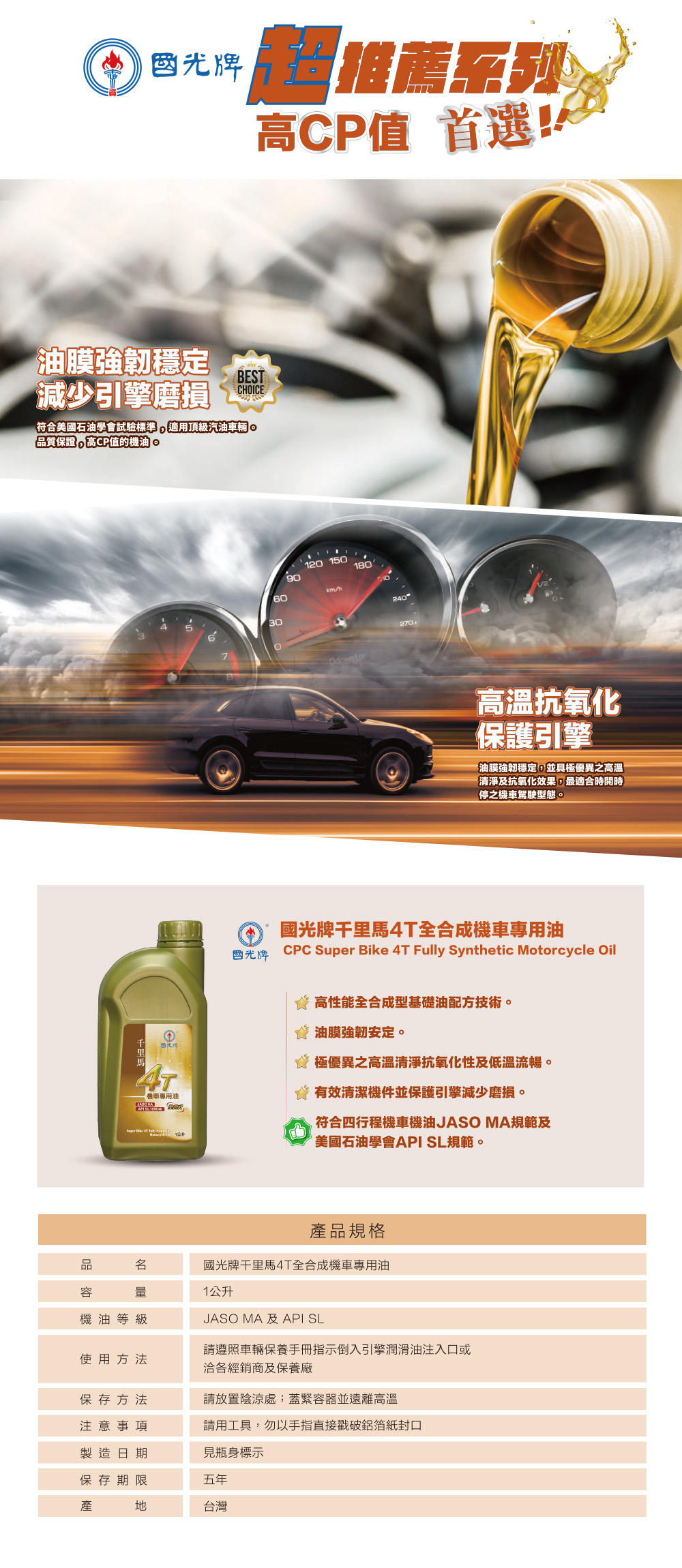 符合日本車輛標準組織學會JASO MA和美國石油學會API SJ規範,適用於JASO MA和API SJ等級的汽油四行程引擎機車的潤滑需求。本油的黏度為10W/40,針對四行程引擎機車的使用特性,採用高性能合成型基礎油和最新配方技術,使引擎機件的保護油膜強韌穩定,並具有極優異的高溫清淨性、抗氧化性和低溫流暢效果,最適合台灣地區城鄉時開時停的機車駕駛型態。適用於加裝觸媒轉化器的現代四行程引擎機車,能降低機件磨損,有效清潔引擎積污,延長引擎壽命。
