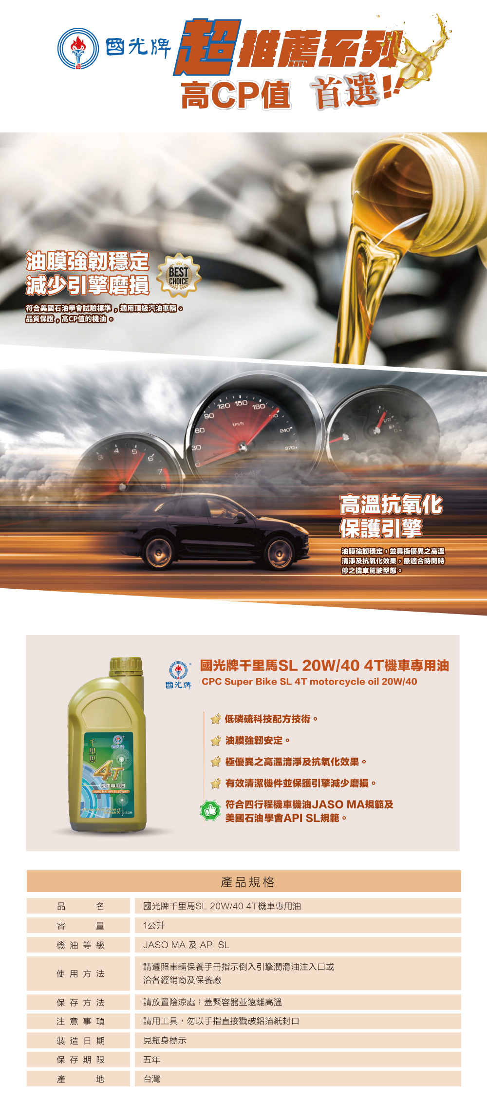 適用於符合美國石油學會API SL等級和日本車輛標準組織學會四行程機車機油JASO MA等級的四行程汽油引擎機車的潤滑需求。本油的黏度為SAE20W/40,適用於全年四季,特別適用於四行程引擎機車的開停型駕駛方式。採用最新的低磷硫科技配方技術,油膜穩定且強韌,具有極佳的高溫清潔和抗氧化效果。完全適用於加裝觸媒轉化器的現代化四行程引擎機車,能降低機件磨損,有效清潔引擎積污,延長引擎壽命。