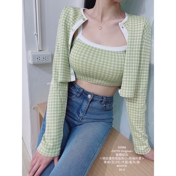 現貨綠💗 32568 -OOTD - 蜜糖組合 <格紋攪色短版背心+長袖外罩