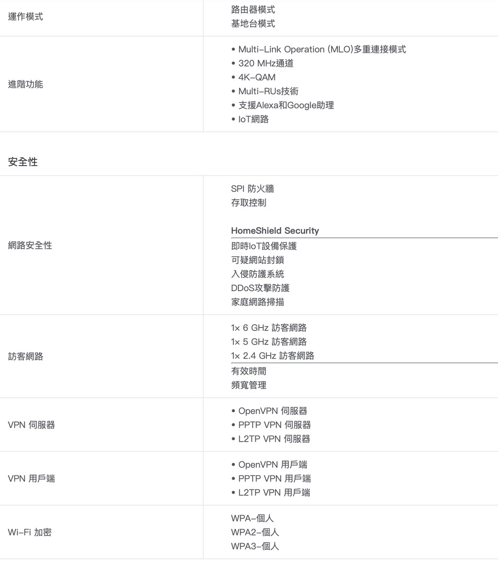 12串流 22 Gbps 三頻 WiFi – 11520 Mbps(6 GHz)+8640 Mbps(5 GHz)+1376 Mbps (2.4 GHz)†