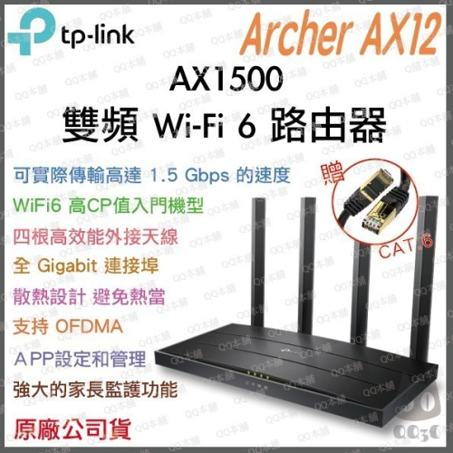 下一代 1.5 Gbps 速度 : Archer AX12 雙頻路由器速度更快,最高可達 1.5 Gbps(5 GHz 頻段為 1201 Mbps,2.4 GHz 頻段為 300 Mbps)