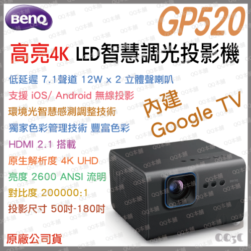 《 BenQ 明基 原廠 短焦 送 原廠包》GP520 4K DLP LED 智慧調光 高亮 投影機 行動投影機 微投