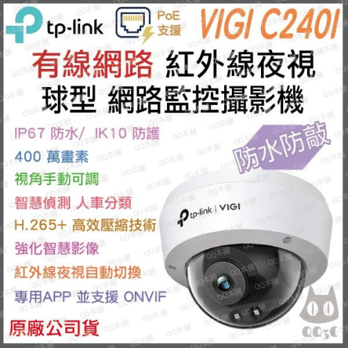 《 tp-link 原廠 紅外線夜視 防水 有線 PoE 》VIGI C240I 球型 防撞 攝影機 監視器 攝像頭